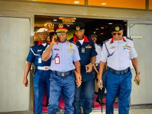 The CG was also well received at the Murtala Muhammed International Airport and the Presidential Wing, by the Assistant Commandant General, in charge of Zone A, ACG Olasupo Solomon, PhD, the State Commandant, CC Usman Alfadarai, Ag. Head of Operations, Head of Anti – Vandal Unit, ACC Musa Abdullahi Jibrin, Officer in charge of Airport, Chief Superintendent of Corps Kalejaye Olusola, Public Relations/Protocol team and other senior officers of the Command, before he later embarked on his journey again.