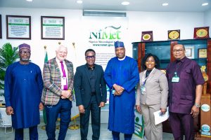 The Director-General and Chief Executive Officer of Nigerian Meteorological Agency (NiMet), Prof. Charles Anosike, on Tuesday, 6th February, 2024, received in audience the Managing Director/Chief Executive Officer of Nigerian Airspace Management Agency (NAMA), Engr. Umar Ahmed Farouk (3rd right in the group photograph), and the Managing Director/Chief Executive Officer of Avsatel Communications Ltd, Mag. Georg Eder (2nd left), at the agency’s headquarters in Abuja.