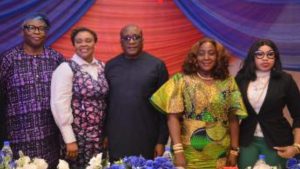From left Mr Dayo Adeola, Chairman, Board of Trustees, National Association of Nigeria Travel Agencies, NANTA; Mrs Susan Akporiaye, President, NANTA; Dr Allen Onyema, Chairman, Air Peace; Mrs Alice Onyema, Vice Chairman, Air Peace; and Mrs Oluwatoyin Olajide, Chief Operating Officer, Air Peace during the Air Peace Travel Agents Forum for the launch of the airline’s London route held in Lagos on Thursday.